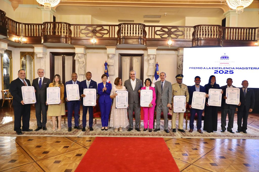 Santo Domingo.— El presidente Luis Abinader entregó este miércoles el Premio a la Excelencia Magisterial 2025 a tres docentes ejemplares, en reconocimiento a su sobresaliente trayectoria profesional, el impacto transformador de su labor pedagógica y su firme compromiso con la formación de las nuevas generaciones dominicanas.