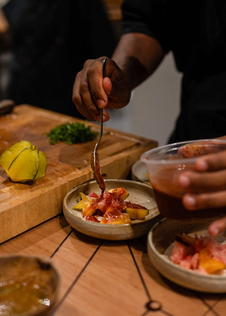 El restaurante involucra a artistas, cocineros, artesanos y la comunidad local, promoviendo el aprendizaje continuo y la colaboración interdisciplinaria. Cada aspecto del espacio ha sido diseñado meticulosamente, desde los utensilios artesanales hasta la decoración, creando una atmósfera cálida y acogedora. Por ese motivo, la propuesta es que los comensales reserven y paguen su menú por adelantado, permitiéndoles soltarse y disfrutar plenamente de la experiencia que el restaurante ha diseñado especialmente para ellos. Desde el momento en que llegan, se embarcan en un viaje sensorial, donde cada detalle ha sido cuidadosamente preparado para sumergirlos en la riqueza cultural y gastronómica del Caribe.