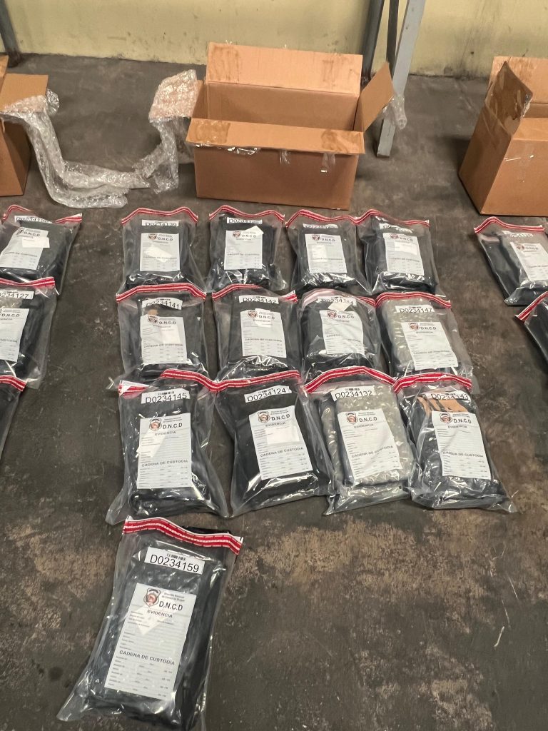 Por disposición del fiscal actuante se procedió a la apertura de cuatro cajas que contenían suministros médicos y prendas de vestir. En su interior se ocuparon los 98 paquetes de marihuana, debidamente empacados al vacío, con un peso total de 112 libras, según certificó el Instituto Nacional de Ciencias Forenses (INACIF).