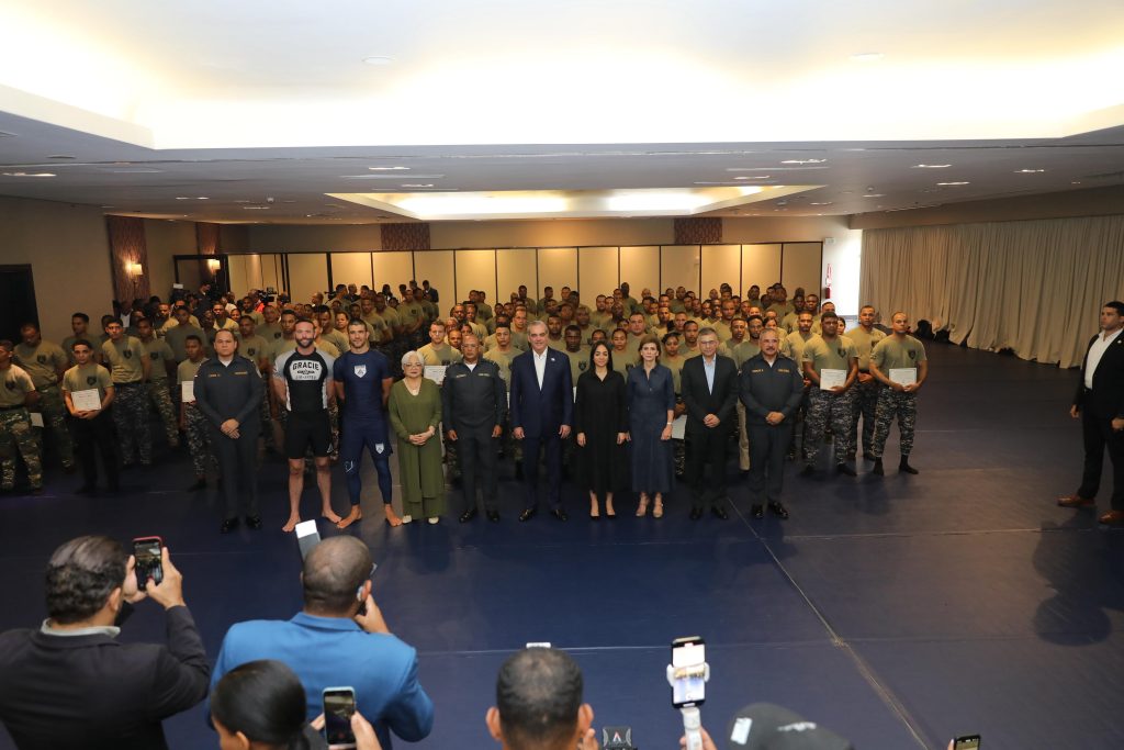 Santo Domingo. – El presidente Luis Abinader encabezó este miércoles la clausura oficial del curso Gracie Survival Tactics (GST), en el que participaron 140 integrantes de la Policía Nacional, así como 11 miembros del Ministerio de Defensa y de la Dirección General de Migración, donde también dejó formalmente inaugurado el curso para Instructores de Instructores en el Sistema Táctico Básico Policial, el cual será impartido por la Policía Nacional de Colombia.