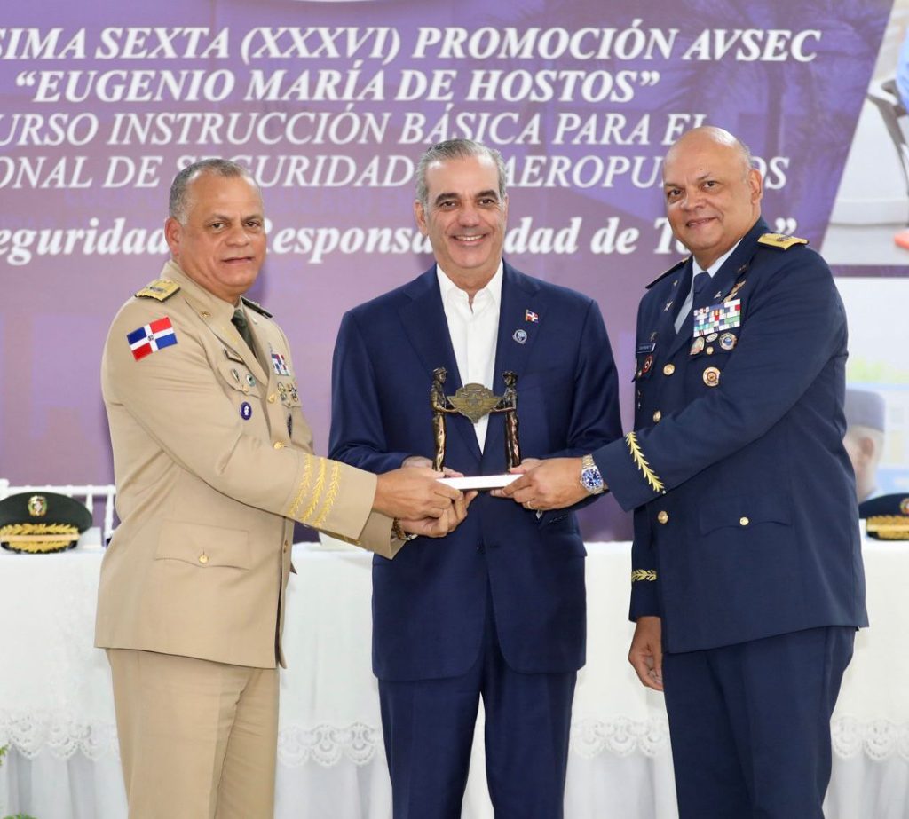 Santo Domingo.- El presidente Luis Abinader acompañado del ministro de Defensa teniente general Carlos Fernández Onofre, encabezó este jueves el acto de graduación múltiple del Cuerpo Especializado en Seguridad Aeroportuaria y de la Aviación Civil (CESAC), correspondiente a la Trigésima Sexta Promoción del Curso de Instrucción Básica para el Personal de Seguridad de Aeropuertos “Eugenio María de Hostos”, en el marco de la conmemoración del 29.º aniversario de esa institución.