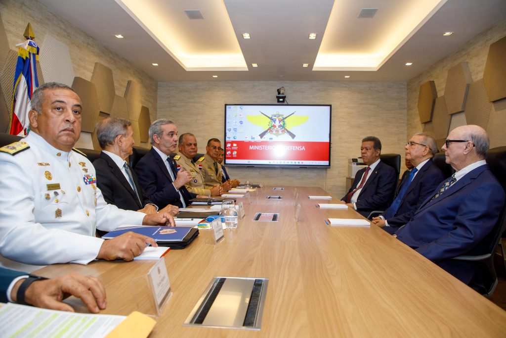 El presidente Abinader junto al ministro de Defensa, teniente general Carlos Antonio Fernández Onofre, recibió a los ex mandatarios, dándoles la bienvenida y agradeciendo el gesto de su presencia en esta reunión.